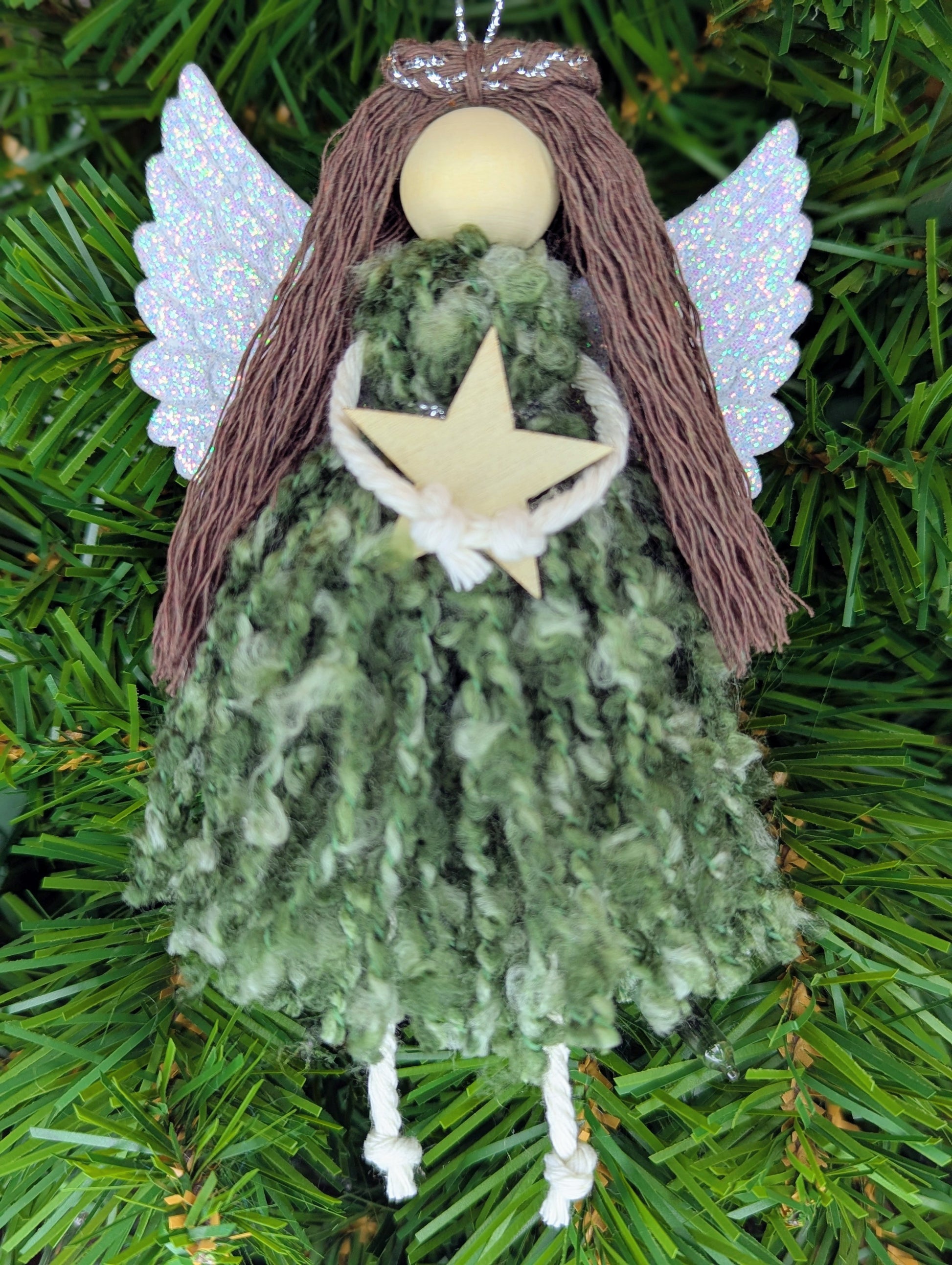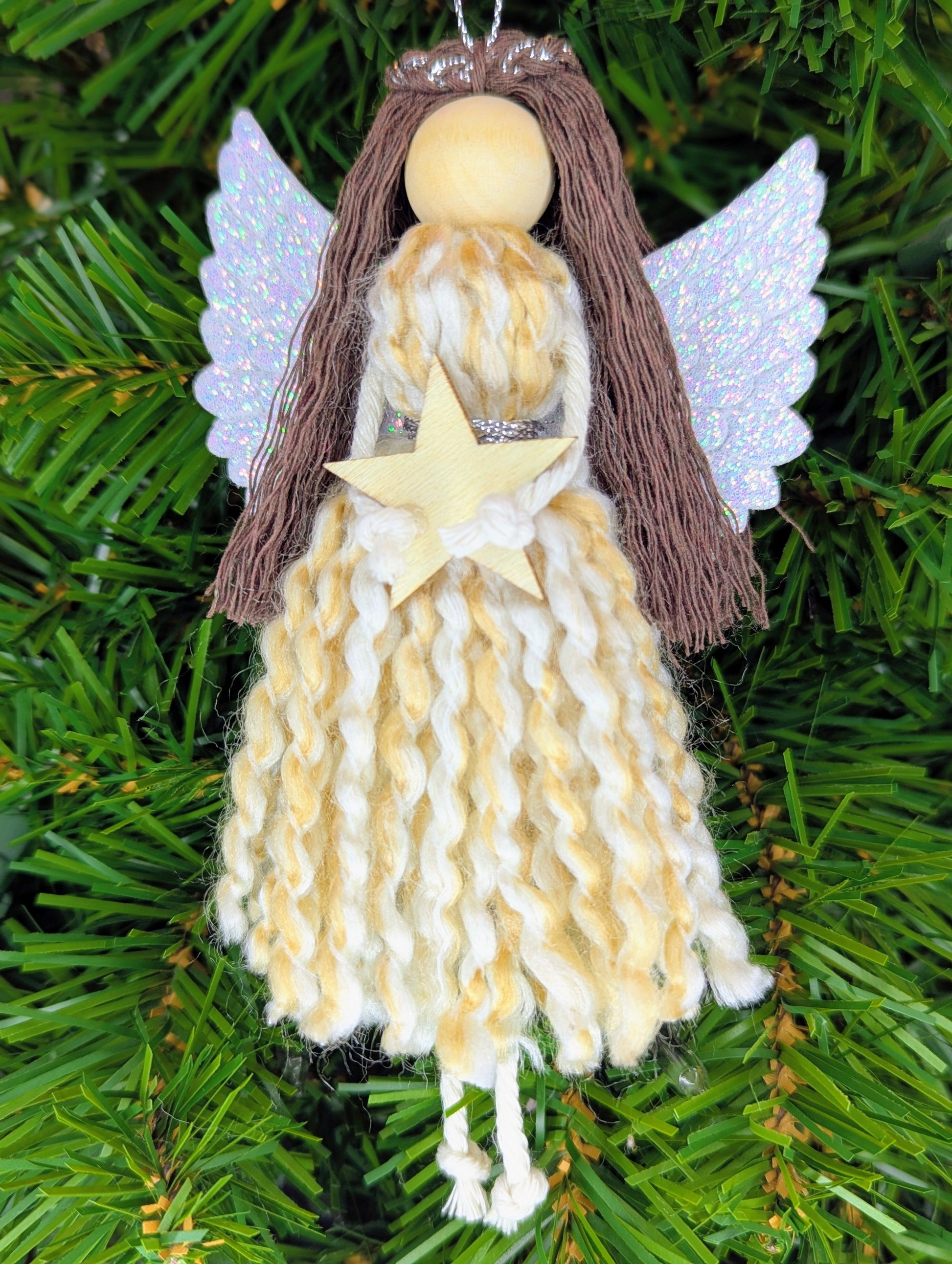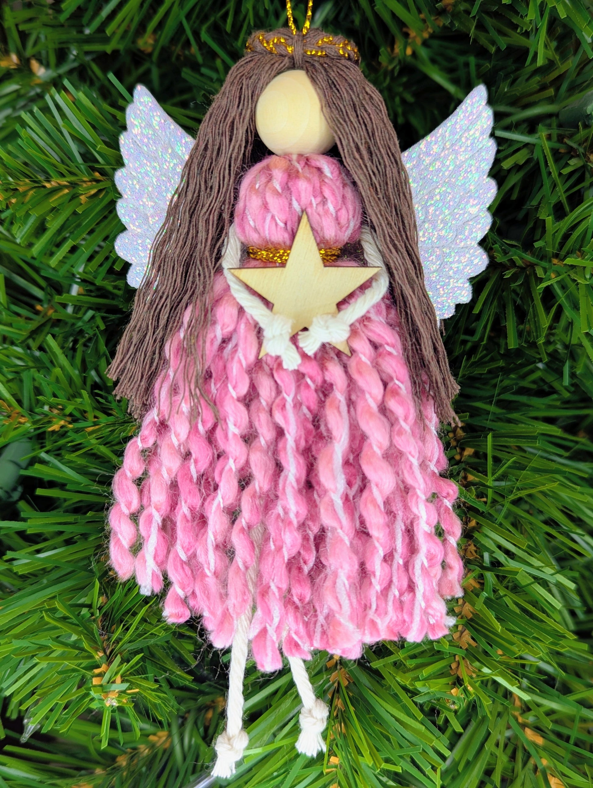 This angel doll ornament radiates both elegance and sweetness. With her shimmering glitter wings and a wooden star in hand, she makes a thoughtful and charming addition to your tree or any space, bringing warmth and beauty wherever she’s displayed.